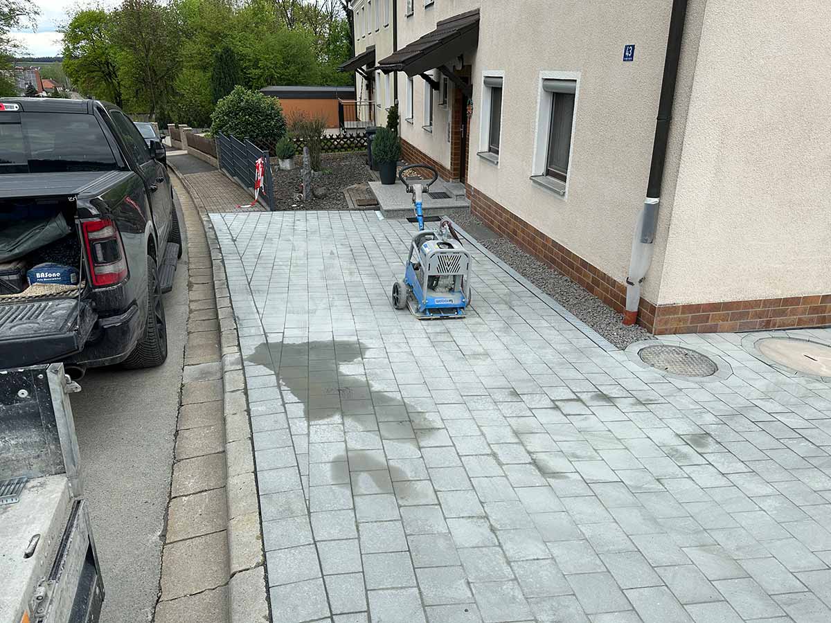 Abbruch des alten Pflasters und des Unterbaus. Errichtung eines neuen tragfähigen Untergrunds, auf dem 200 m2 neues Pflaster verlegt wurden. Zusätzlich wurden ACO-Rinnen vor der Garage anbebracht.