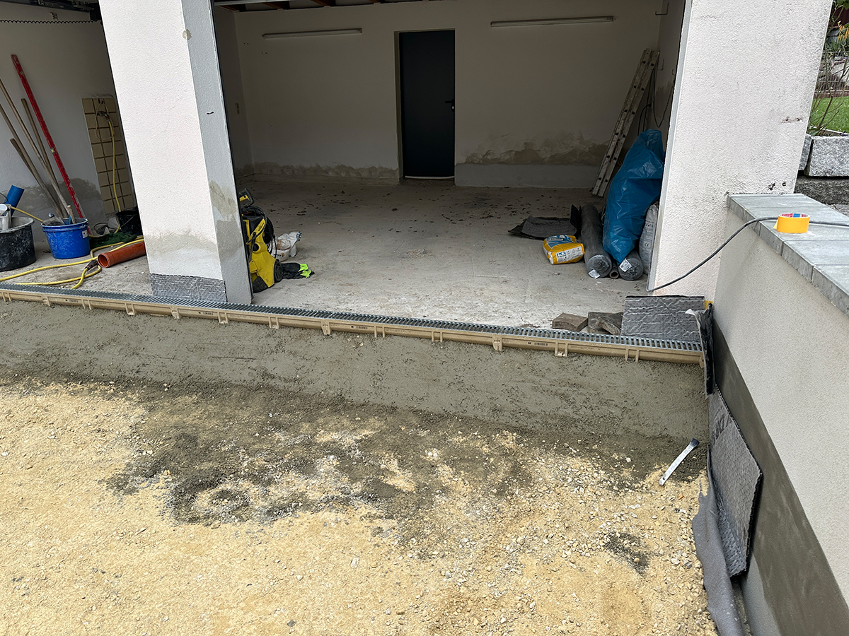 Abbruch des alten Pflasters und des Unterbaus. Errichtung eines neuen tragfähigen Untergrunds, auf dem 200 m2 neues Pflaster verlegt wurden. Zusätzlich wurden ACO-Rinnen vor der Garage anbebracht.