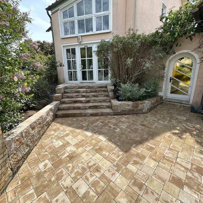 Im Zuge der Neugestaltung dieses Gartens wurde die Granitverkleidung und die Terasse abgerissen. Daraufhin wurden Abdeckungssteine an der Wand gesetzt und die Wand verputzt. Wir setzten Blockstufen, pflasterten die Terasse und erweiterten die Betonwand mit Schalugnssteinen.